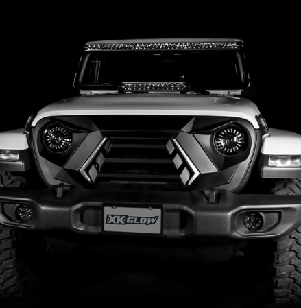 You ask and we deliver! Introducing our all new XKchrome LED Grill for Jeep Wranglers and Gladiators. The aggressive styling, matte black finish, and the integrated RGBWA LED lights will make your Jeep one of a kind! The kit includes our industry-leading XKchrome Bluetooth Controller with millions of colors to choose from, a DIY Theme Builder, Music Sync, and so much more. For those of you who like to keep it simple, we’ve added pure white LED chips into the lights for a bright white DRL mode. And when you hit the turn signal, the left or right side will illuminate in an eye-catching sequential pattern. Congratulations! You just found your next mod!