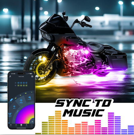 XKmax LED Motorcycle Underglow Light Kit (also known as motorcycle accent lights) is compatible with all types of bikes such as Harley-Davidson cruisers, Yamaha baggers, Kawasaki sport bikes, Honda trikes, and more. The flexible LED strips and compact light pods allow for easy and precise installation.